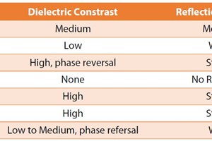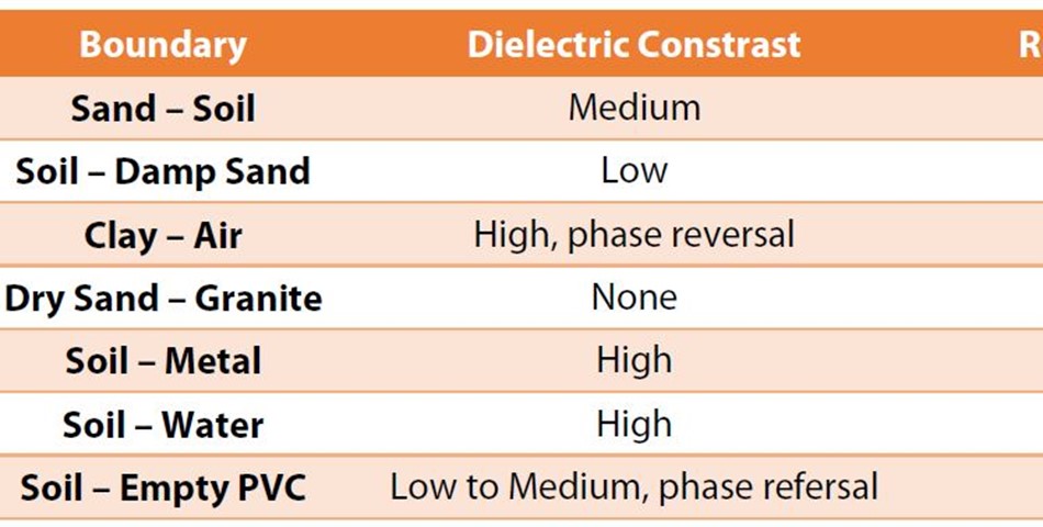 The value assigned to the GPR velocity through a material is called its dielectric. For example, air has a dielectric of 1 and water has a dielectric of 81, so all other materials have a value somewhere between 1 and 81. We use the dielectric value to calculate the radar velocity. GPR equipment is looking for differences in the dielectric of the material, so surveying may be more difficult when two materials have electrical properties that are too similar. Users must assess whether there is enough difference between the target they are looking for and the target’s host material. When scanning concrete, operators may be looking for electrical and telecom conduits. These can be tougher to locate than metallic reinforcing steel, due to the slight variation in dielectric from the concrete and these targets (especially if housed in PVC pipe).