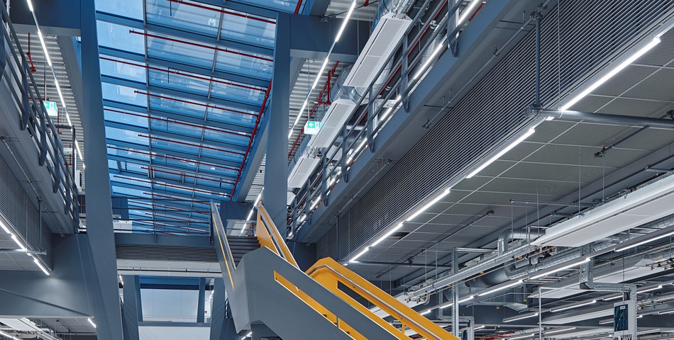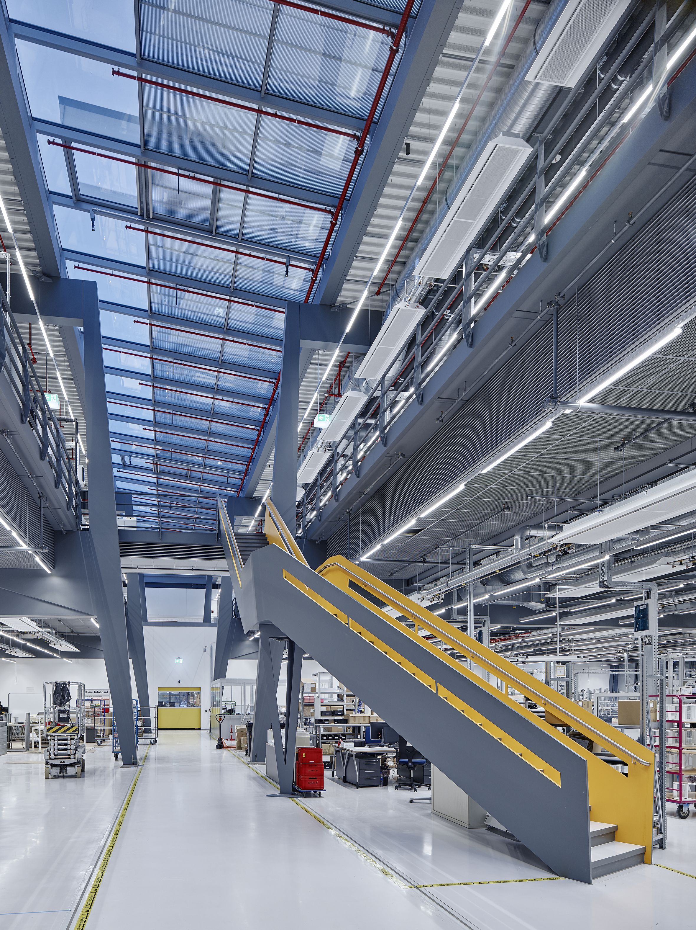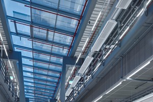 The ingenious supporting structure enables easy expansion: intermediate levels can be retracted increasing the floor space as needed. The angle of the steel supports in the production hall has various advantages: firstly, the areas can be used without any limitations through the construction of the building – and secondly, the angle creates funnel-shaped spaces between the individual production aisles – so-called “light funnels”, which bring the daylight deeply into the interior. The vividness of the architecture and the supporting structure were very important to the architects. For them, the dynamics and the solidness of the system are the important functional attributes.