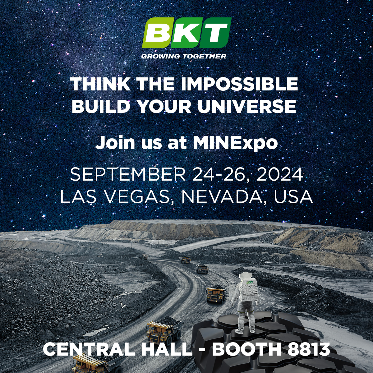 Las Vegas, September 19, 2024 - BKT, a leading Off-Highway tire manufacturer, will be a key player at MINExpo 2024, one of the world's top events for the mining industry, scheduled for September 24-26 at the Las Vegas Convention Center. BKT will be present in the Central Hall at booth 8813 presenting a substantial range of solutions for this sector.